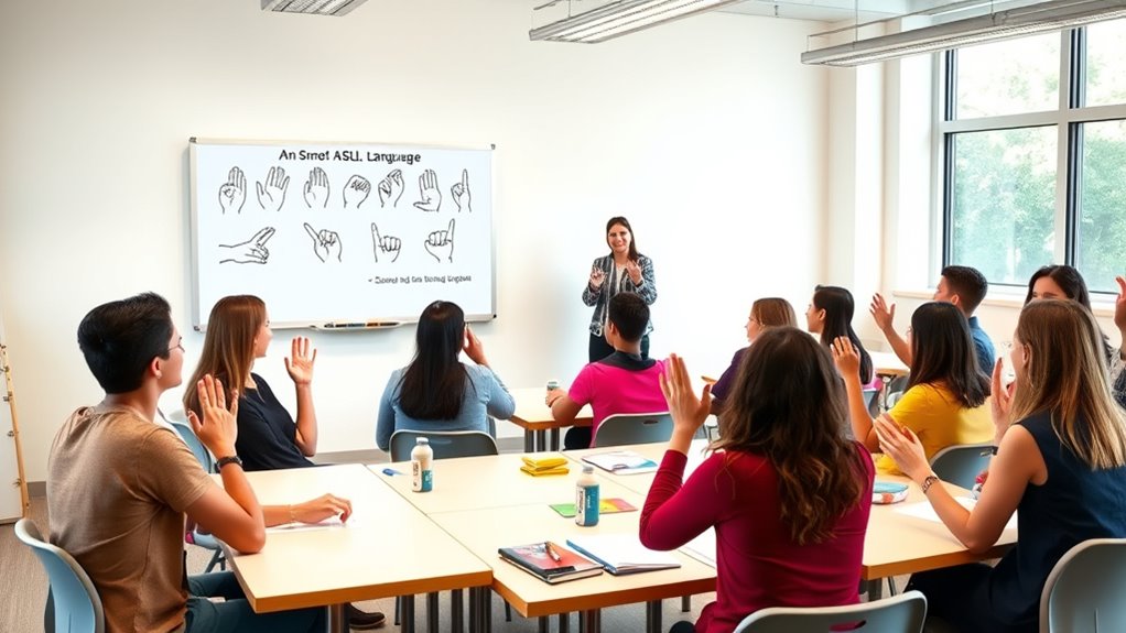 Many community colleges, universities, and local libraries offer both in-person and online ASL courses for beginners and advanced learners, often at little or no cost. To get started, find nearby programs that suit your schedule and learning style. Incorporating technology like Intelligent Tutoring Systems (ITS) can enhance your learning experience by providing personalized feedback and tailored content. Search for an ASL course that provides structured lessons, direct interaction with instructors, and chances to practice with other students. Organizations like Gallaudet University and local deaf centers also host virtual classes and workshops accessible from anywhere, giving you more flexibility. Some programs even offer certification upon completion, which can boost your professional or academic credentials. Enrolling in local or virtual programs helps you build a solid foundation in ASL while connecting you with a community of learners.